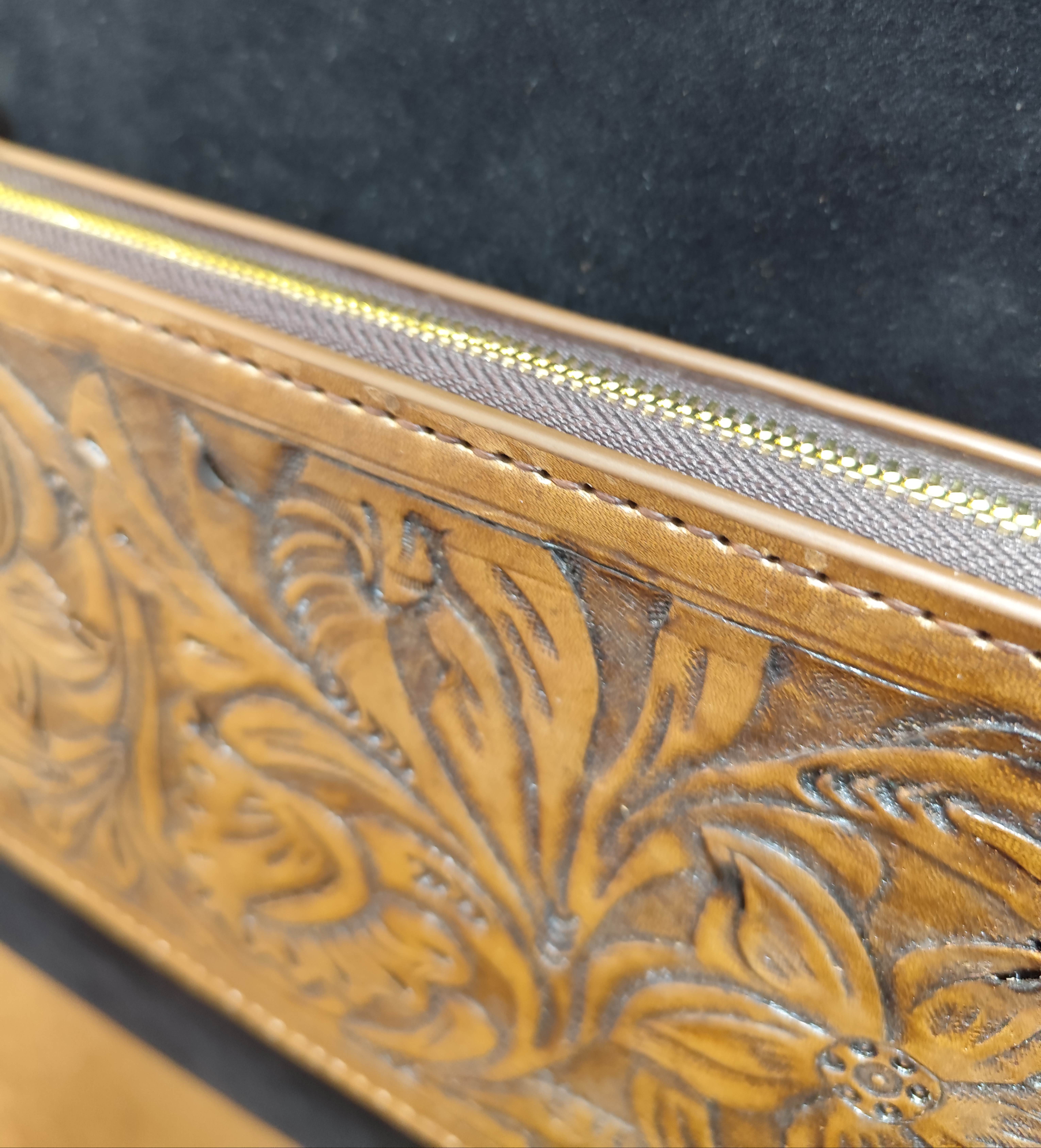 نقش گل ها و برگ ها با دقت و ظرافت روی چرم طبیعی حک شده اند و جلوه ای شاعرانه و زنانه به کیف بخشیده اند.